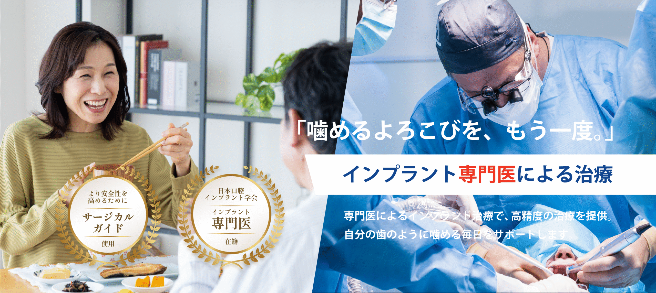 当院では、単にインプラントを埋入するだけではなく、長期にわたり健康を維持できる「治療計画・咬合設計・メンテナンス」までを重視。専門性と安心感を兼ね備えた治療体制で、患者さま一人ひとりに最適なインプラントをご提案いたします。インプラントは、正しく選び、正しく管理すれば、10年・20年先も快適に使い続けることができます。失った歯を、確かな技術で取り戻しましょう。