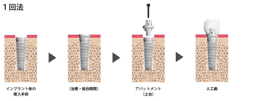 1回法は、インプラントを埋め込む手術と同時に歯ぐきの上に支台部(アバットメント)を露出させる治療方法です。2回法のように歯ぐきを再度切開する必要がないため、手術回数が1回で済み、身体への負担や治療期間を短縮できるのが大きなメリットです。ただし、インプラントが口腔内に露出した状態で治癒期間を過ごすため、適応には感染リスクが低く、骨の状態が良好なケースに限られます。症例を慎重に見極めた上で選択される、安全性と効率性を兼ね備えた治療法です。