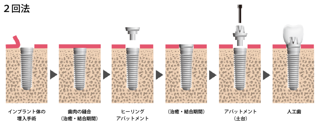 2回法は、インプラント治療で最も一般的な手術方式で、インプラント体を顎の骨に埋め込んだ後、完全に骨と結合するまで数ヶ月待ち、その後に歯ぐきを再度開いて人工歯を取り付ける方法です。外部からの刺激を避けながら確実に骨と結合させることができるため、長期的な安定性が高く、幅広い症例に適応できます。特に骨量が少ないケースや治癒を慎重に見極めたい場合に適しています。治療期間は長くなりますが、安全性と予後の良さが魅力です。